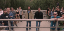 Dean se detiene en un puente y sale. Tiene que ser el puente más feo de la Columbia Británica. Me gusta lo que hicieron con la última escena, pero en realidad podrían haber encontrado un lugar mejor. Cuando Dean mira el río de abajo, siente que Sam se acerca a él. Por supuesto, los dos se abrazan. Dean está listo para mostrarle a Sam las cuerdas del cielo y la cámara retrocede y nos ponemos negros. Luego nos sentaremos con Ackles y Padalecki en el puente para agradecer a los fanáticos, y luego nos retiraremos para ver a todo el elenco. Robert Singer dice «y corta» por última vez y terminamos.