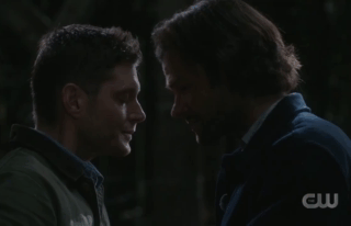 Esta es la tercera «escena de muerte» real – completa con un discurso – para Dean, y para mí esta es la más débil de las tres. La primera de la tercera temporada, «Sin descanso para los malvados», es la mejor para mí: la más emotiva, sincera y Dean-esque de las tres. Esto pareció llevar demasiado tiempo y era demasiado grande. Sospecho que esto podría deberse a que tanto Ackles como Padalecki pensaron que si iban al pozo emocional se ahogarían en él, ya que este es su episodio final. También se informó que Singer dejó gran parte de la escena a voluntad, tal vez la filmación estaba tomando demasiado tiempo. Ciertamente hay algunos problemas de continuidad: hay una lágrima en el rostro de Dean, su rostro está seco. Hay muchas llamadas de vuelta: Dean repite el mantra familiar y Sam promete encontrar otro camino. Sam repite las palabras de Dean del piloto de que no puede y no quiere hacerlo sin Dean.