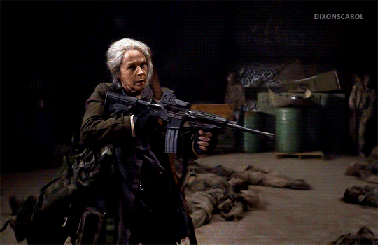 Es bueno ver a Cassady con su bastón modificado, a Kelly con su cabestrillo, a Rosita con su machete, y el resto le hace justicia al arco y la flecha. Intentan recoger las armas desechadas de los soldados, pero no encuentran ninguna que siga disparando o tenga munición. Maggie encuentra una pistola y Carol encuentra una ametralladora que funciona. Carol es la última en el piso y se detiene para llenar su mochila con más MRE. Daryl, y todos los demás parecen haberse quedado sin flechas para cubrirlos, pero Daryl lanza sus dos cuchillos. Es difícil estar realmente nervioso por Daryl o Carol cuando sabemos que van a un programa derivado … Sin embargo, es un buen toque cuando ella se sube y le da a Daryl su cuchillo a juego. La última toma que obtenemos muestra a los tres viejos guardias, Daryl, Carol y Maggie, mirando a los caminantes que miran hacia arriba.