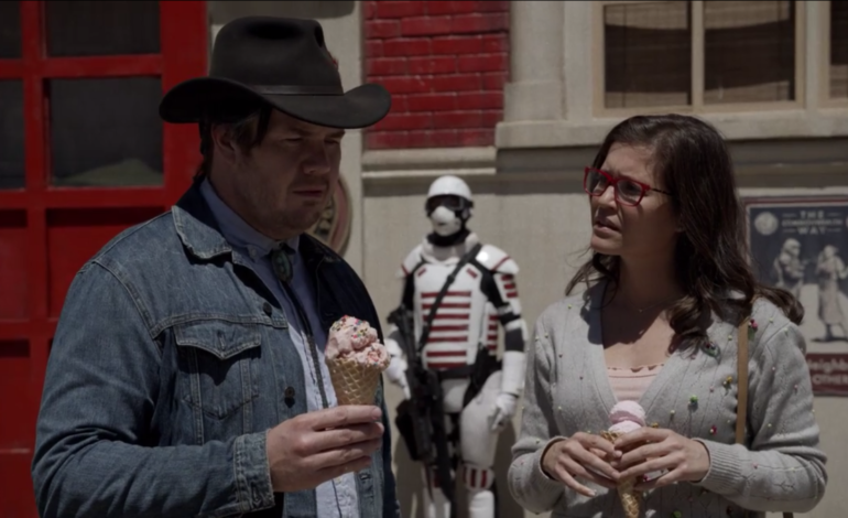 Eugene disfruta de su helado de todos modos, diciéndole a Stephanie que el lugar tiene todo tipo de comodidades que ni siquiera sabía que extrañaba. Su fecha pintoresca y la plaza del pueblo con familias se ven socavadas por los guardias armados que están alrededor y los carteles de reclutamiento y regulación que se alinean en las calles detrás de ellos. Eugene le dice que le gustaría quedarse, pero ya no lo está. Tiene que regresar y ayudar a sus amigos. Stephanie desearía poder ayudar a reducir la burocracia, pero no está segura de cómo.